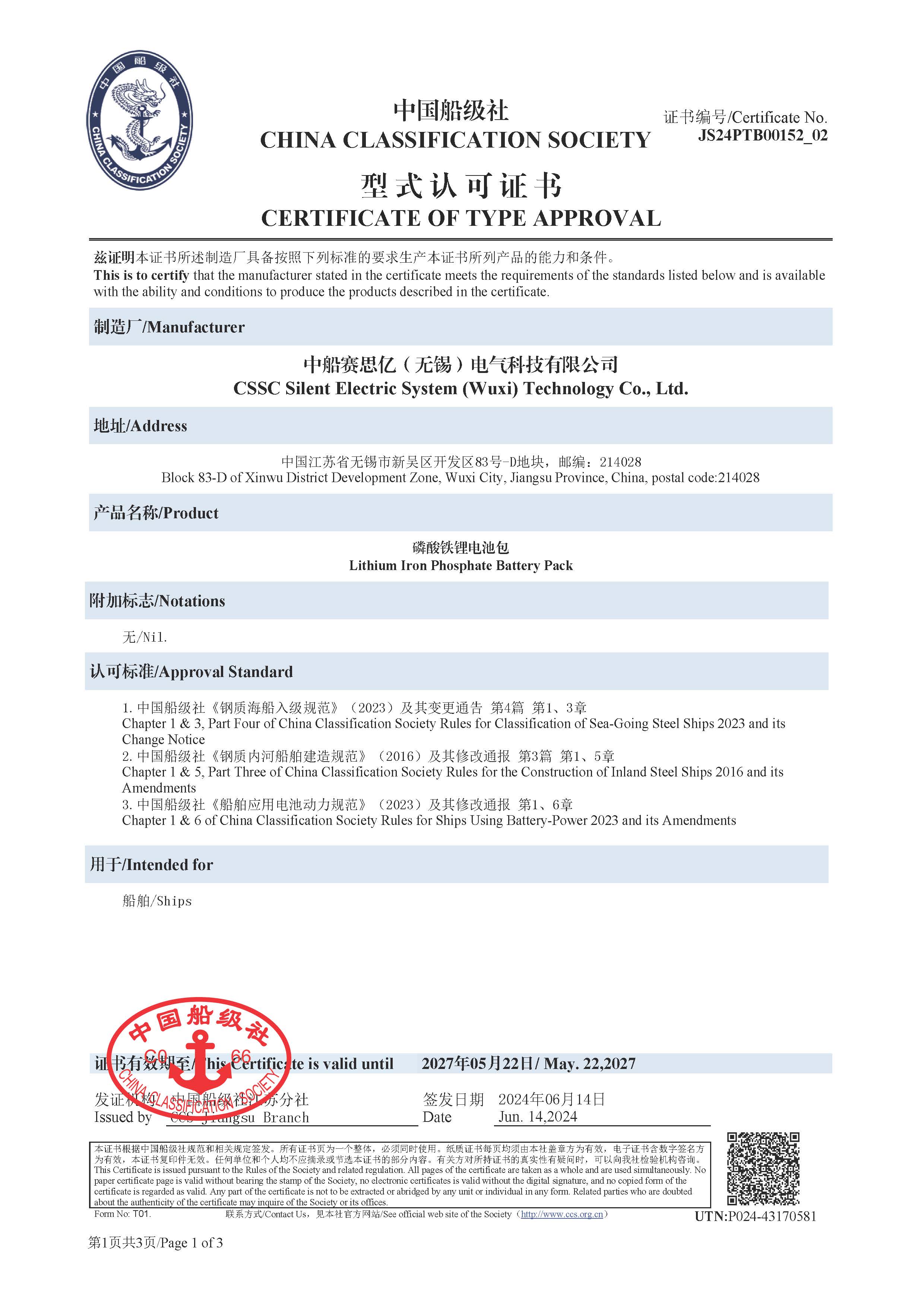 電池包、箱式電源及電池管理系統(tǒng)(BMS)獲中國船級社型式認可。