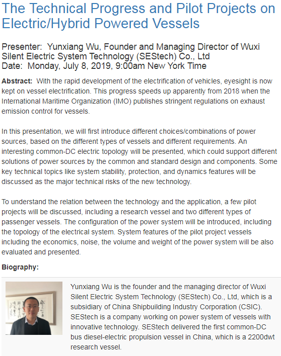 7月8日,賽思億總經(jīng)理烏云翔在IEEE Transportation Electrification Community舉辦了網(wǎng)絡(luò)研討會,進(jìn)行電力及混合動力船舶技術(shù)介紹及實船案例分享。