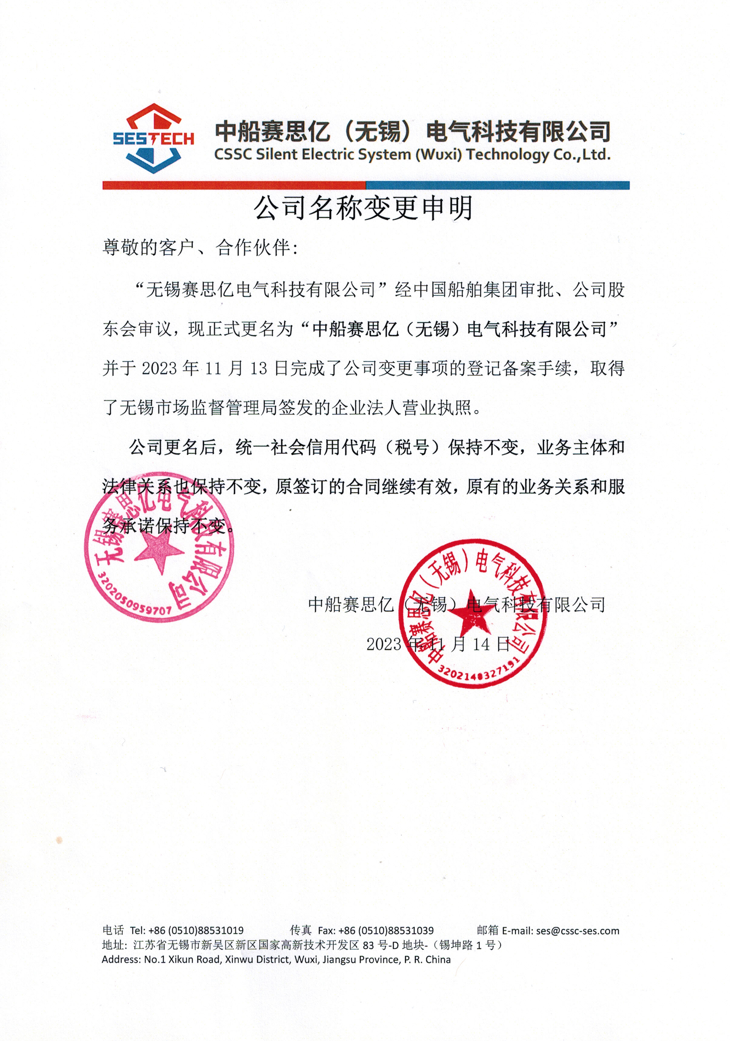 經(jīng)中國船舶集團(tuán)審批、公司股東會(huì)審議,2023年11月13日,無錫賽思億電氣科技有限公司正式取得無錫市場監(jiān)督管理局簽發(fā)的企業(yè)法人營業(yè)執(zhí)照,更名為“中船賽思億(無錫)電氣科技有限公司”,簡稱“中船賽思億”。