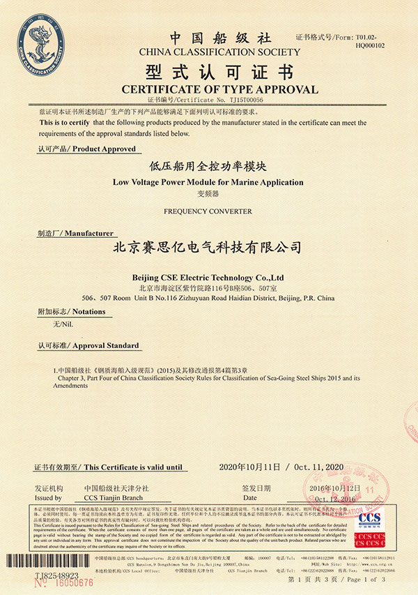 ? ? ? 歷經(jīng)5個月的審核和試驗,公司的低壓船用變頻器核心功率模塊在2016年10月獲得中國船級社“低壓船用全控功率模塊”的型式認(rèn)可證書,認(rèn)可范圍包括:LM4018-AC,LM4023-AC,LM4035-A,該系列產(chǎn)品電壓等級為400V,功率分別為180kW、230kW和350kW,與之前賽思億所獲得產(chǎn)品認(rèn)可不同,型式認(rèn)可證書為賽思億低壓系列船舶核心變頻功率模塊的認(rèn)可,該認(rèn)可的獲得標(biāo)志著公司的低壓船用變頻器系列核心功率模塊在產(chǎn)品特性、性能指標(biāo)、工作環(huán)境等方面完全符合中國船級社的相關(guān)規(guī)定。