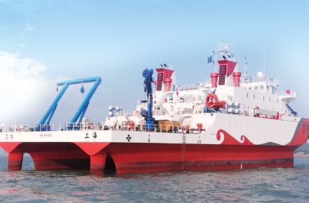 沈括號科學調(diào)查作業(yè)船,采用S-DE柴電電力推進系統(tǒng),雙體小水線面設(shè)計,2200T科考船,是中國首個直流組網(wǎng)電力推進船舶。
