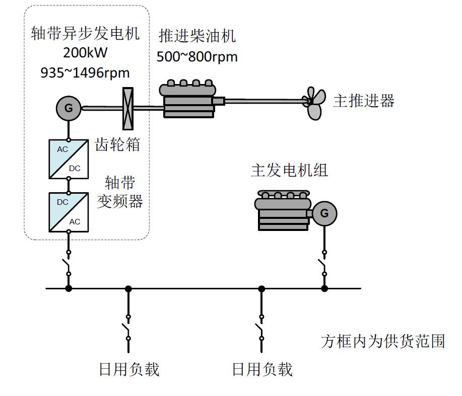 高欄01/02散貨船,采用S-Hybrid 主機(jī)+電力推進(jìn)混合動力系統(tǒng),在不改變船舶原有主機(jī)動力形式的前提下,充分利用船舶在遠(yuǎn)洋航線的經(jīng)濟(jì)航速工況,通過主機(jī)冗余功率帶動異步電機(jī)發(fā)電運行,在提高主機(jī)負(fù)荷率改善其油耗的同時,可以關(guān)停船舶輔機(jī),節(jié)省了船舶的運營油耗。