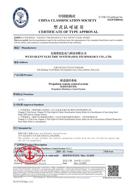推進遙控系統(tǒng)-CCS-型式認可證書
