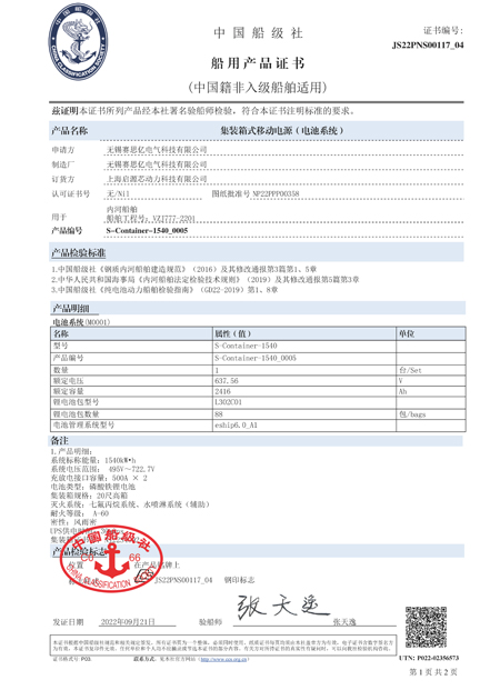 電池包、箱式電源及電池管理系統(tǒng)(BMS)獲中國船級社型式認可。