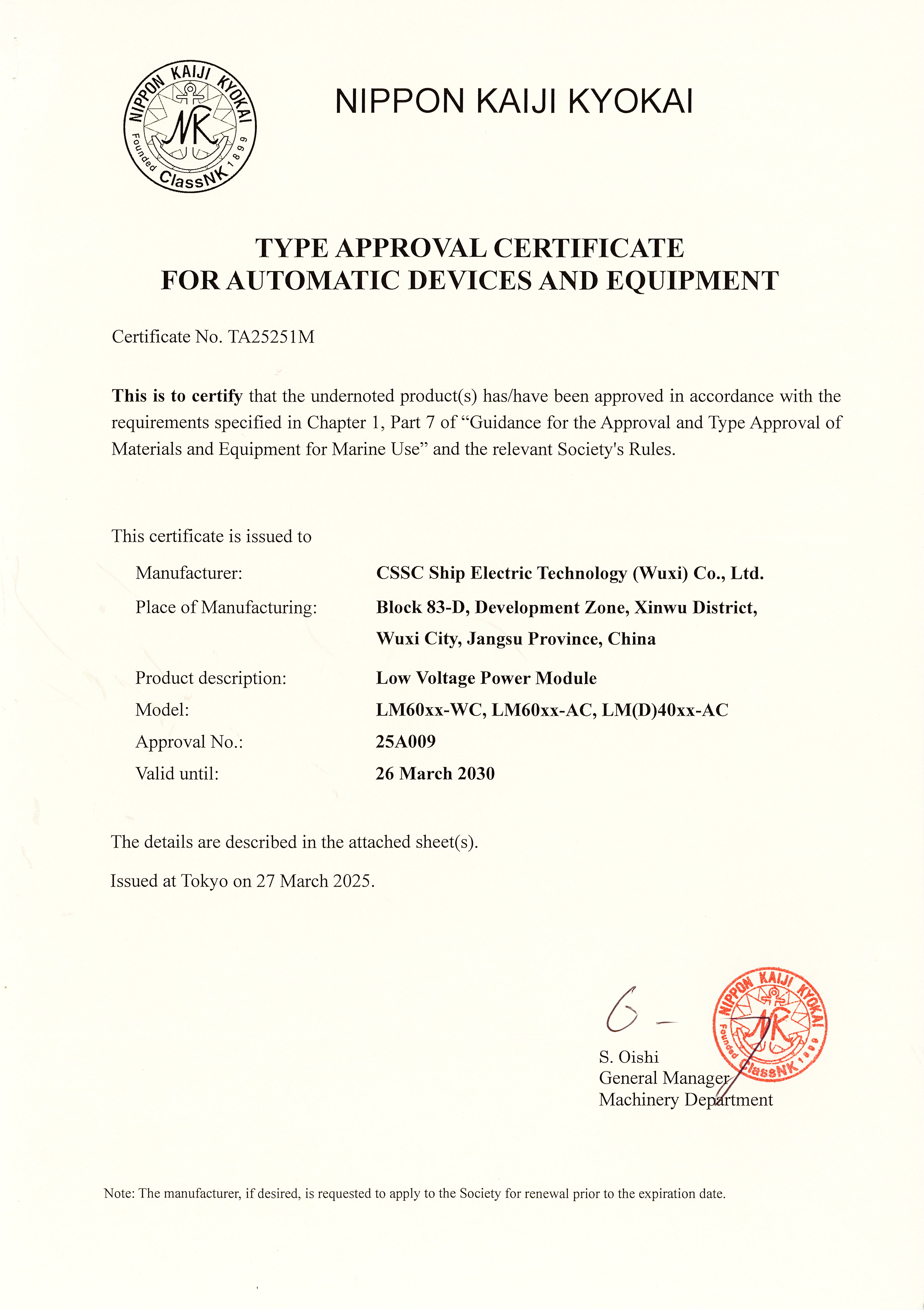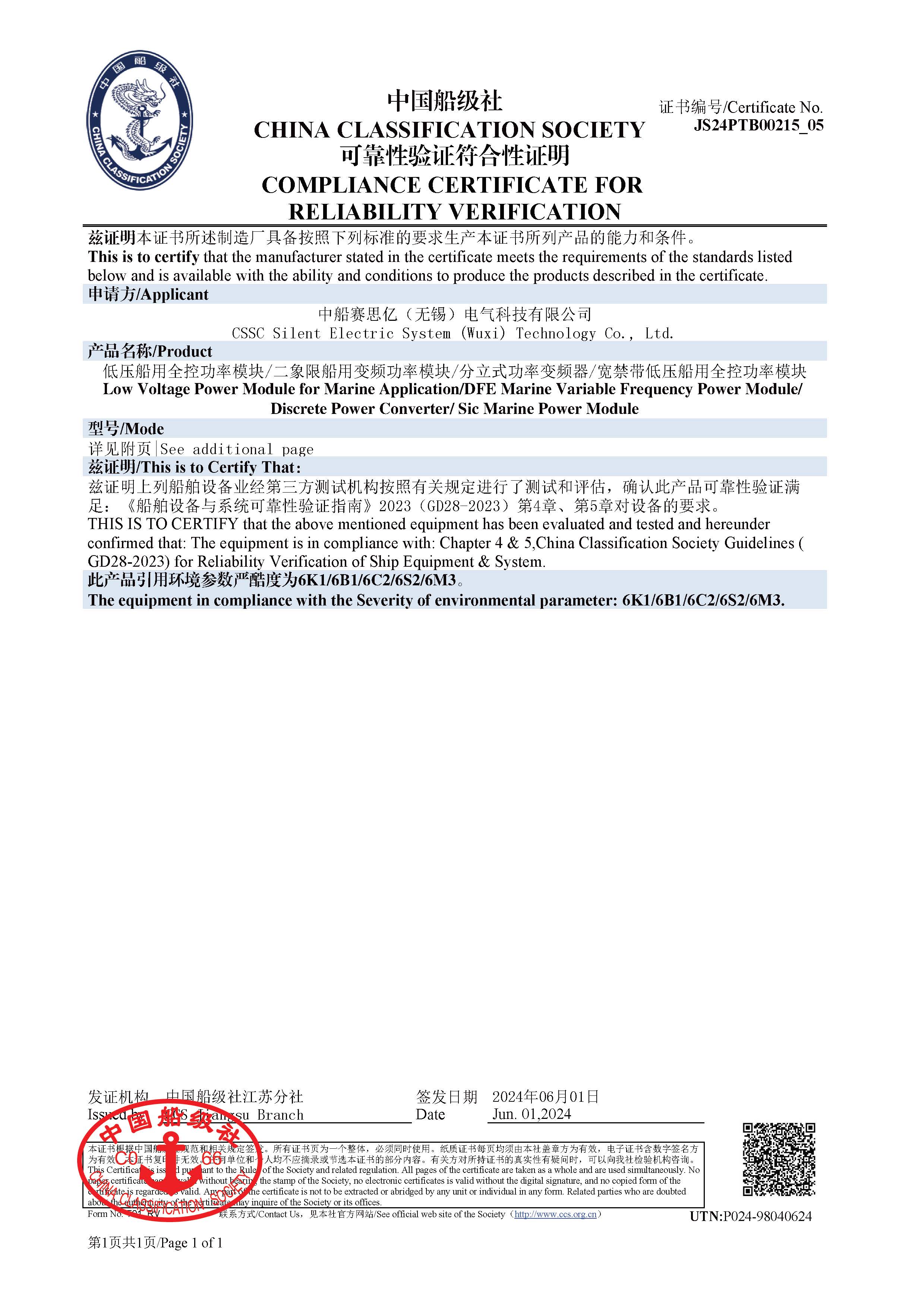 低壓船用核心功率模塊系列產(chǎn)品獲得了中國船級社、法國船級社、挪威船級社等主流船級社的型式認可,