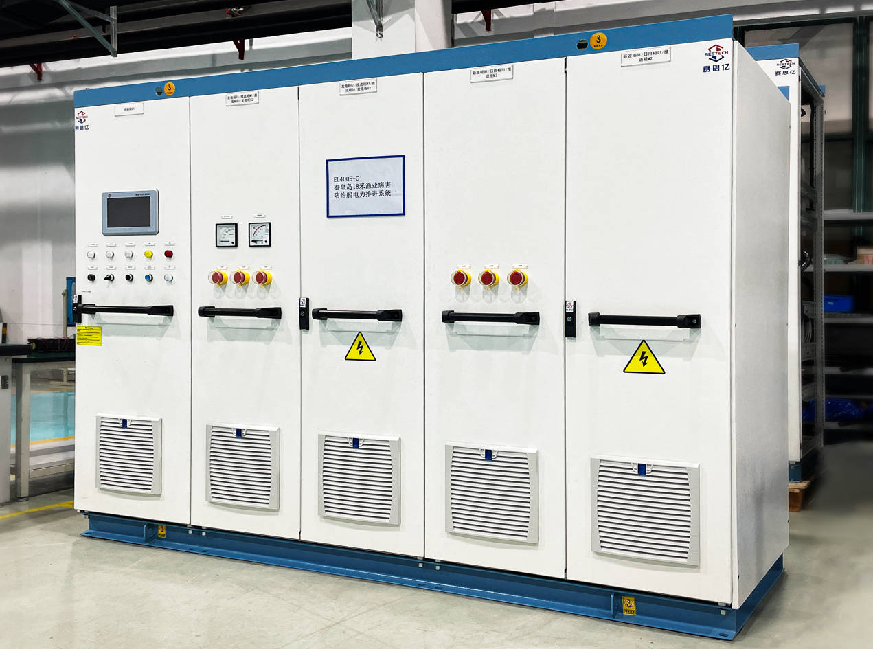 該6艘系列船舶由漁業(yè)機(jī)械儀器研究所設(shè)計(jì)、蘇州飛馳環(huán)保科技股份有限公司建造,總長(zhǎng)19.60m,設(shè)計(jì)水線長(zhǎng)18.50m,型寬4.60m,型深1.80m,設(shè)計(jì)吃水1.20m,系統(tǒng)配置2臺(tái)90kW的發(fā)電機(jī)組,1套322.56kWh鋰電池組,是新一代節(jié)能環(huán)保船型,主要用于秦皇島北戴河及附近海域赤潮治理工作。其中,變頻控制柜、鋰電池組、主推進(jìn)電機(jī)、推進(jìn)遙控系統(tǒng)、交流配電板、主變壓器等動(dòng)力系統(tǒng)設(shè)備均由賽思億集成供貨,而動(dòng)力系統(tǒng)關(guān)鍵裝備——變頻控制柜、推進(jìn)遙控系統(tǒng)均由賽思億負(fù)責(zé)設(shè)計(jì)生產(chǎn)和制造,擁有完全自主知識(shí)產(chǎn)權(quán)。