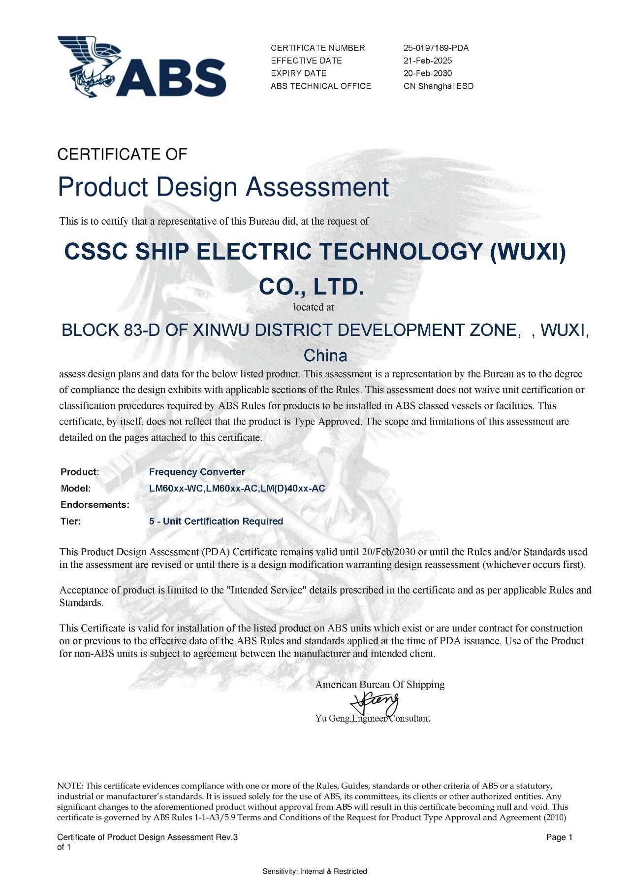 2025年2月21日,中船賽思億(無(wú)錫)電氣科技有限公司(CSSC Ship Electric Technology ( Wuxi) Co.,Ltd.)核心變頻電控設(shè)備順利取得美國(guó)船級(jí)社(ABS)型式認(rèn)可證書(shū),成為國(guó)內(nèi)為數(shù)不多的取得美國(guó)船級(jí)社(ABS)型式認(rèn)可證書(shū)的船舶電力推進(jìn)企業(yè)。目前中船賽思億已取得CCS、BV、RINA、DNV、LR、ABS等六大國(guó)際主流船級(jí)社型式認(rèn)可證書(shū),是目前國(guó)內(nèi)唯一一家擁有六大船級(jí)社型式認(rèn)可證書(shū)的國(guó)產(chǎn)船舶電力推進(jìn)企業(yè),對(duì)中船賽思億的海內(nèi)外市場(chǎng)開(kāi)拓和國(guó)際化發(fā)展進(jìn)程,具有重要意義。