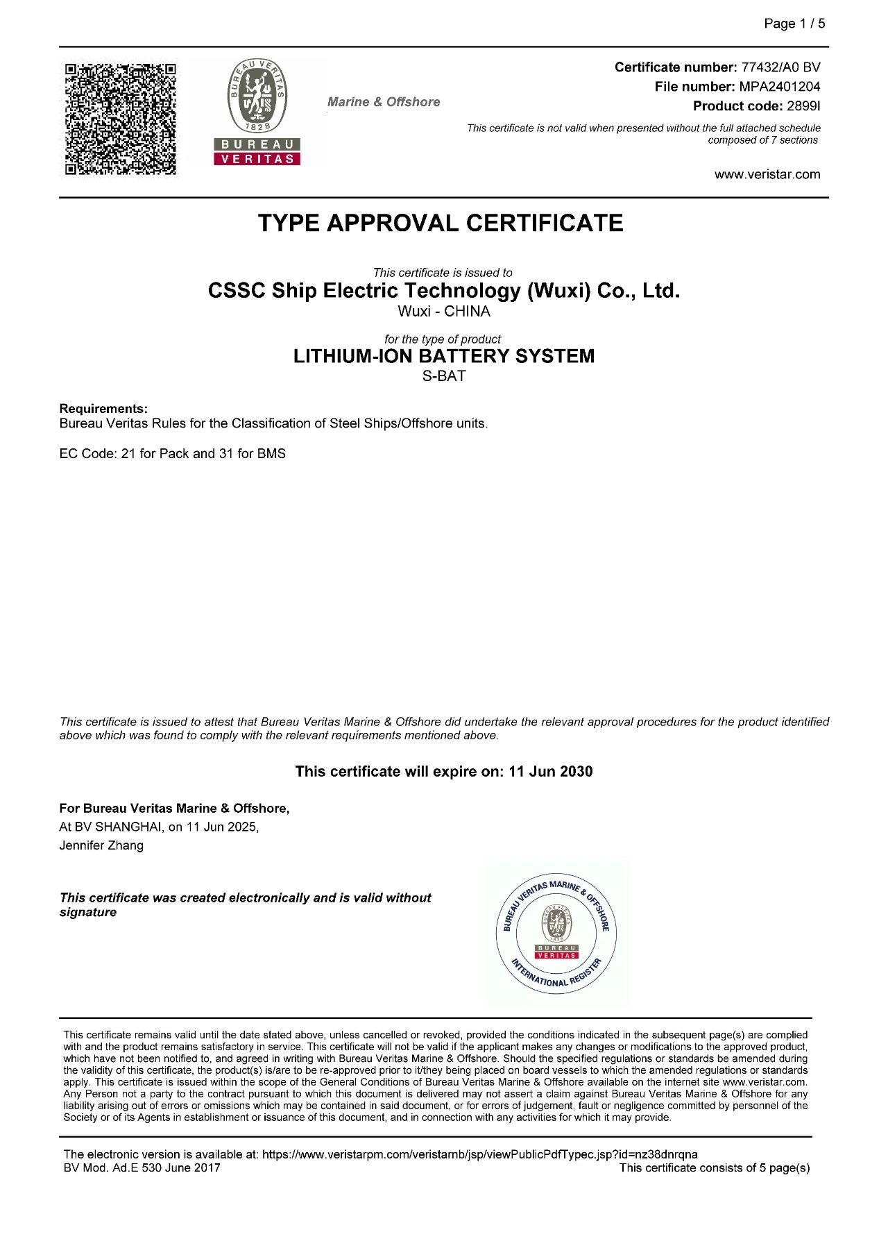 中船賽思億磷酸鐵鋰電池系統(tǒng)順利取得法國(guó)船級(jí)社(BV)型式認(rèn)可證書(shū)!