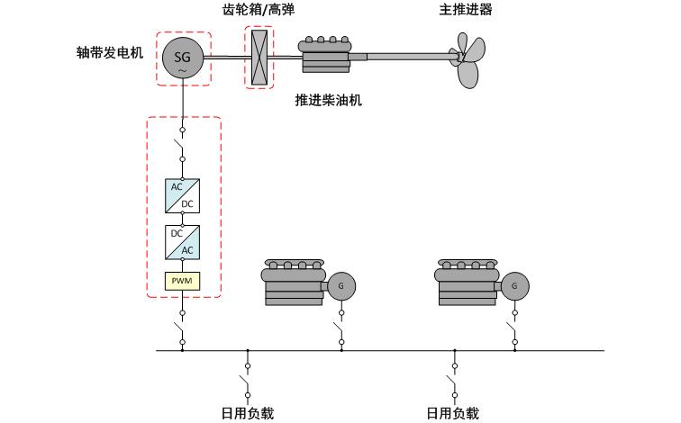 • 軸帶電機(jī)和推進(jìn)主機(jī)通過機(jī)械方式連接;